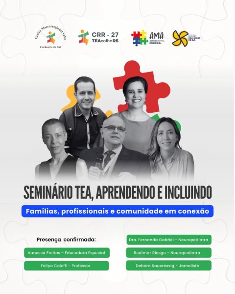 O Centro Regional de Referência em Transtorno do Espectro Autista (CRR 27 – AMA Cachoeira do Sul), unidade especializada do programa TEAcolhe, promove no dia 29 de novembro o Seminário “TEA: Aprendendo e Incluindo!”, um dia inteiro para aprofundar o conhecimento, trocar experiências e fortalecer os laços entre famílias, profissionais e amigos da causa. O evento acontecerá no Salão de Atos da Ulbra, com o apoio do Centro Macrorregional em TEA Educação e da Secretaria Municipal da Saúde.