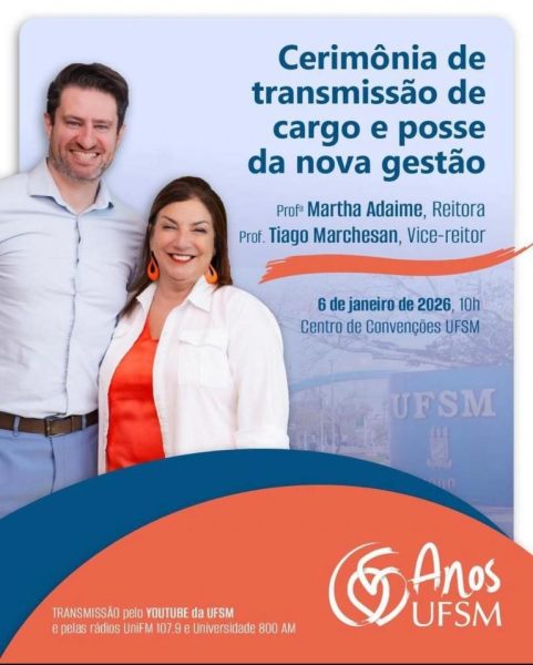 A cerimônia de transmissão de cargo e posse da nova gestão está marcada para o dia 6 de janeiro de 2026, às 10h, no Centro de Convenções da UFSM. Na ocasião, Martha Adaime e Tiago Marchesan nomearão os pró-reitores da gestão.